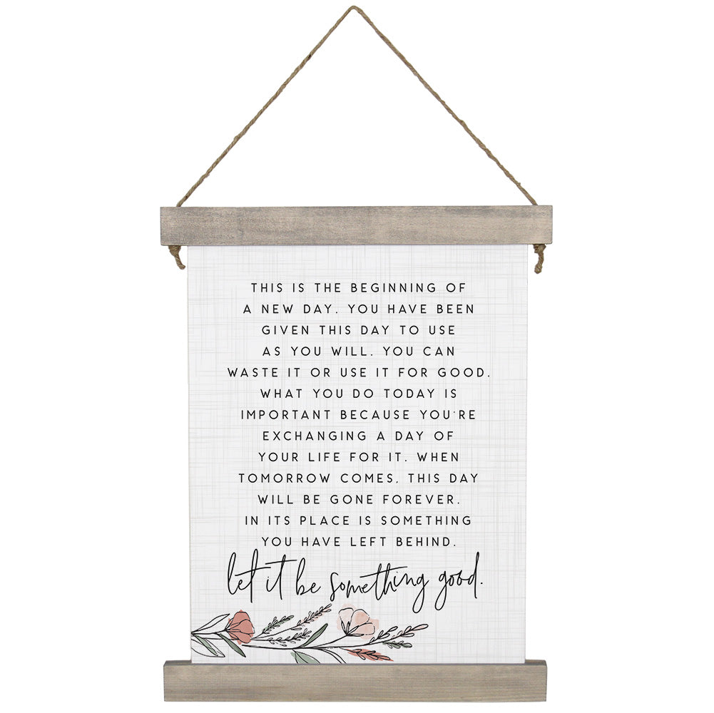 This is the beginning of a new day. You have need given this day to use as you will. You can waste it or use it for good. What you do today is important because you're exchanging a day of your life for it. When tomorrow comes, this day will be gone forever. In it's place is something you have left behind. Let it be something good. This stunning statement piece is where sentiment meets trend to create a sensational piece. A original messages expressed in a simple elegant script and simple san serif font provides the perfect contrast for the trendy floral collages which grace the top left and bottom right corners. The outline of these enhancements in a black are colored coordinating shades of pink by splashes from a watercolor paint brush. This beautiful hand-crafted hanging canvas is composed of a wood frame on top and bottom, held by jute twine. The simplistic design printed on sturdy canvas. Dimensions 15.5" x 28" x .75". Product weight – 9.6 oz. Proudly designed, printed, and made in the USA by Sincere Surroundings.