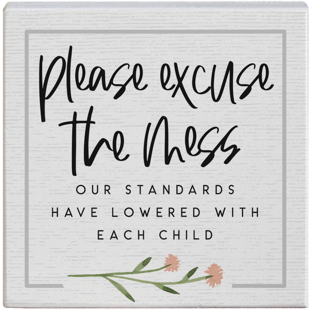 Please excuse the mess. Our standards have lowered with each child. This piece has a white textured background and a simple gray border. The black text is a mixture of a modern script and sans serif. A sweet sprig of flora in deep green and blush pink floats along the bottom. This is a humorous addition to any parents gift, or add it to your own décor! This solid wood piece is intended to be free standing. Dimensions 5.25 x 3.5 x 1.25. Product weight 5 oz. Proudly designed, printed, and made in the USA by Sincere Surroundings.